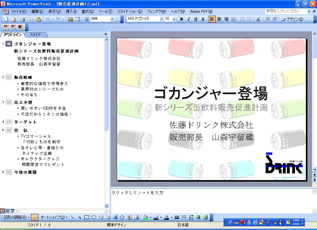 方法1:インスタントウィザードを使用する テーマ構成などが何も決まっていないとき, すでに用意されているウィザードに任せて作成する 方法2:デザインテンプレートを使用する 大まかな流れ,イメージに基づいてレイアウトしたいとき 適当なデザインシートを選択する 方法3:新しいプレゼンテーションを使用する(我々はこれを使用する) 新規に白紙の状態から全体の構成,レイアウトを設計して作成する ポイントはアウトライン機能の活用トップへ