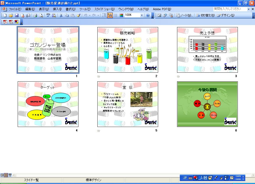 作成が完了したら,スライド一覧でビューを確認する. 図や表を挿入し,見栄えを良くする. 本番はスライドショーで実施する.トップへ