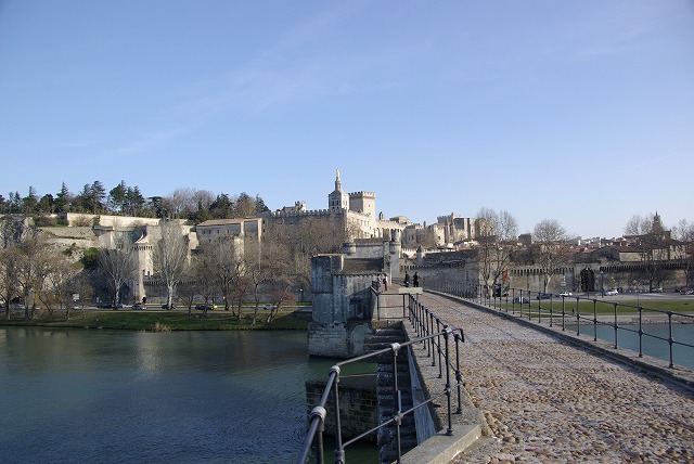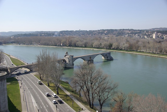 1309年から1377年まで、アヴィニョンには教皇庁が置かれていた。教会権力の頂点に君臨していたわけだから、内部はすばらしい芸術で埋め尽くされていた、と思うが、火災にあって、今はむき出しの壁があるばかりである。もし現存していれば、アヴィニョンの文化的価値は倍加していたろう。上の写真は「アヴィニョンの橋」サン・ベネゼ橋から教皇庁を見たもの、下は、教皇庁の庭園の端からサン・ベネゼ橋を見下ろしたものである。