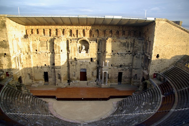 南フランスには、あちこちにローマ帝国時代の遺跡が残っているが、オランジュには最も規模が大きく最も保存状態のよい劇場が残っている。