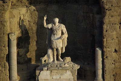 劇場の舞台の上にはアウグストゥスの彫像が据えられている(左)。右は劇場の正面。まるで城壁か砦のようだ。