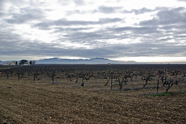 ブドウの木の種類によって畑の様相が異なる。一枚目の写真の木は黒っぽい樹皮で枝を横にはっている。この写真の木は明るい茶色であまり枝を横に張らない。